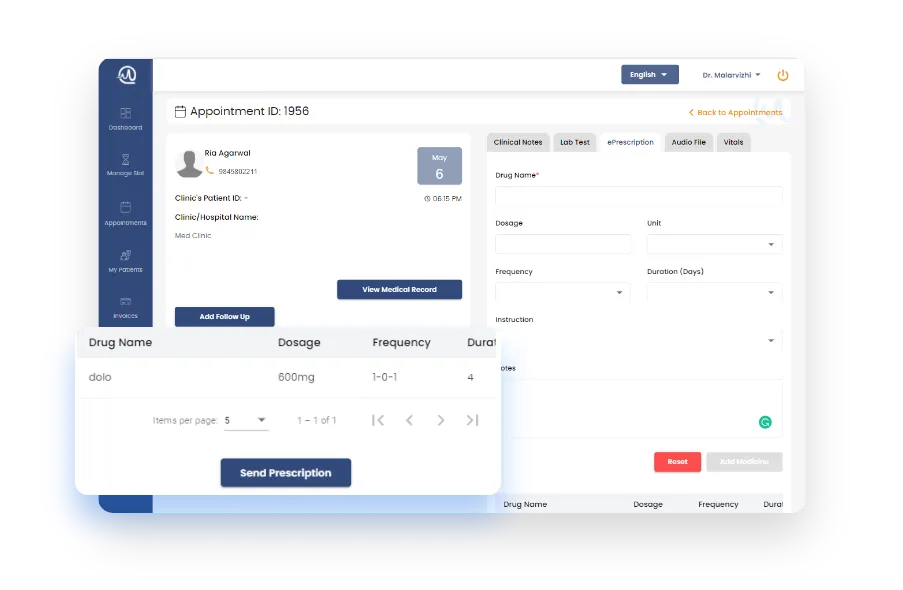 Consult patients through secure and private video consultation from anywhere at any time. Option to share reports, make clinical notes & observations, and e-prescription while on a video call with the patient. Minimize the number of non-critical visits to clinics with the Telehealth consultation module.
